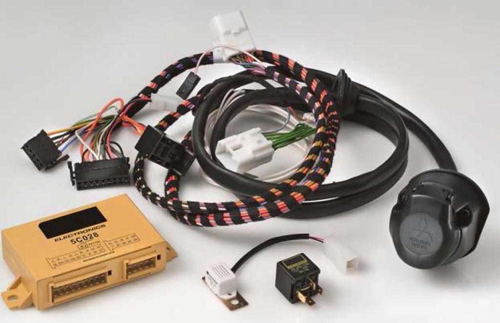 Состоит из отдельного жгута проводки для фаркопа и модуля контроля напряжения цепи. Отдельный жгут позволяет избежать увеличения напряжения в основной сети автомобиля, а контрольный модуль регулирует напряжение в цепи прицепа и информирует водителя о неисправности ламп фонарей прицепа.