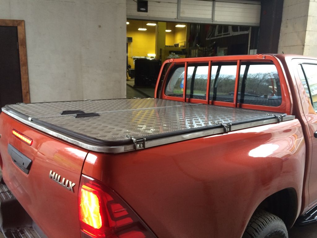 Крышка кузова пикапа Toyota Hilux Revo представляет собой две половинки, которые поднимаются вдоль кузова, это даёт возможность вдвое увеличить пространство над кузовом и повышает вместительность. Для облегчения подъёма в крышка багажника тойота хайлюкс установлены амортизаторы, которые удерживают её при открытие створок, под углом 90 градусов.