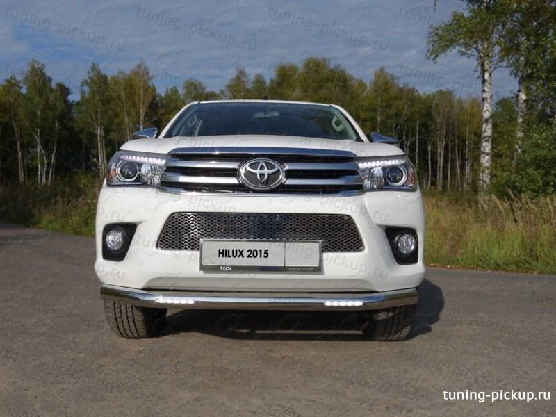 Компания «Пикап-Тюнинг» предлагает владельцам Toyota Hilux Revo 2015-2018 оригинальную защиту переднего бампера со встроенными ходовыми огнями. Выглядит этот защитный аксессуар стильно, но при этом он обеспечивает надежную защиту пластикового бампера от любых механических повреждений.