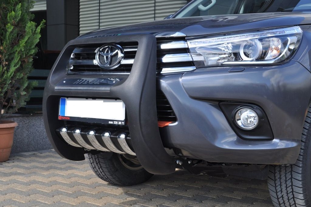Если хотите установить на свой пикап Toyota Hilux 2015-2018 защиту переднего бампера, но модели из нержавеющей трубы вам по каким-либо причинам не подходят, мы предлагаем вам защиту из высокопрочного пластика под названием QT002 PASIFIC. Выглядит этот защитный элемент для Тойота Хайлюкс Рево очень оригинально и дополняет внешний вид пикапа.